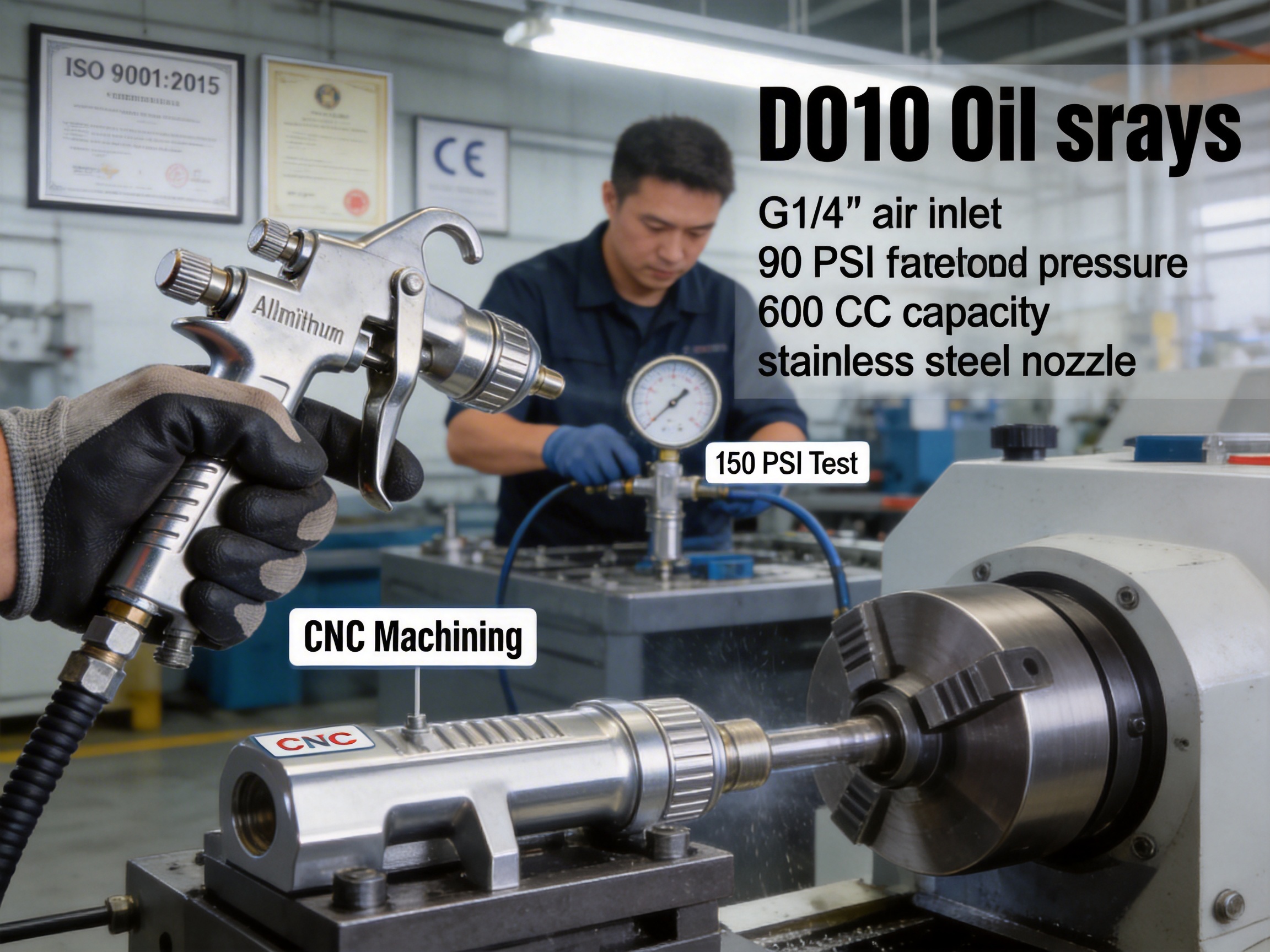 Quality is the cornerstone of the company’s manufacturing process. It follows the ISO 9001:2015 quality management system, which requires strict control over every step of production: - Raw Material Inspection: All materials (aluminum alloy, stainless steel, seals) are tested for purity and durability before being used in production. This ensures that only high-quality materials are used. - In-Process Quality Control: During manufacturing, each component is inspected for precision and fit. For example, CNC (Computer Numerical Control) machines are used to create parts with micron-level accuracy, ensuring that the DO10’s pressure control system works flawlessly. - 100% Functional Testing: Every DO10 spray gun is tested for pressure consistency, spray pattern, and leak resistance. This includes a pressure test at 150 PSI (the maximum safe limit) to ensure that the gun can handle high pressure without failure. - Final Inspection: Before shipping, each unit is visually inspected for defects and packaged according to strict standards.3. Sustainable and Efficient Production
